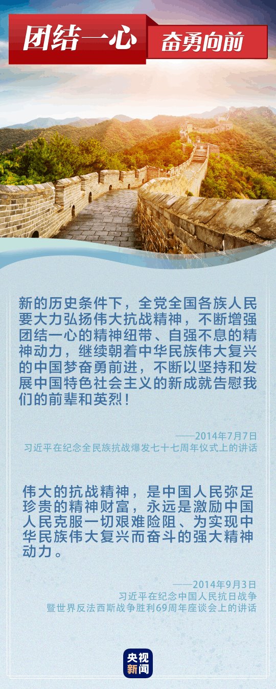 “偉大的抗戰(zhàn)精神,永遠(yuǎn)是激勵(lì)中國(guó)人民克服一切艱難險(xiǎn)阻、為實(shí)現(xiàn)中華民族偉大復(fù)興而奮斗的強(qiáng)大精神動(dòng)力。”“正義必勝!和平必勝!人民必勝!”黨的十八大以來(lái),習(xí)近平總書記多次談到抗戰(zhàn)精神。讓我們重溫總書記重要論述,銘記歷史、奮勇向前。
