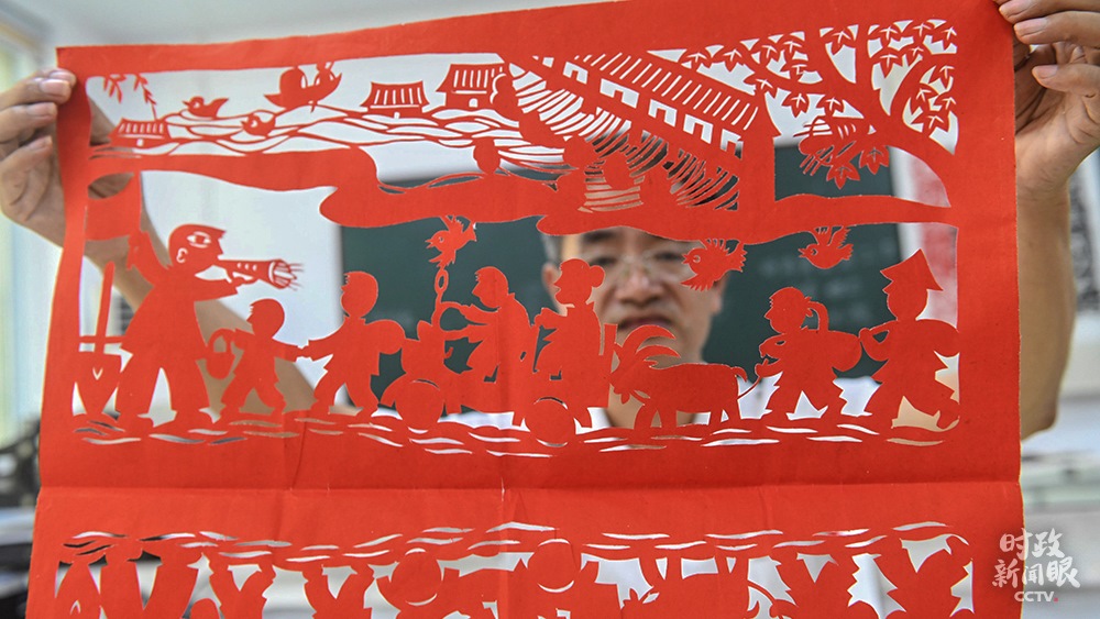 △安徽阜陽市,剪紙藝術(shù)家葛庭友展示創(chuàng)作的“安全轉(zhuǎn)移群眾”作品。