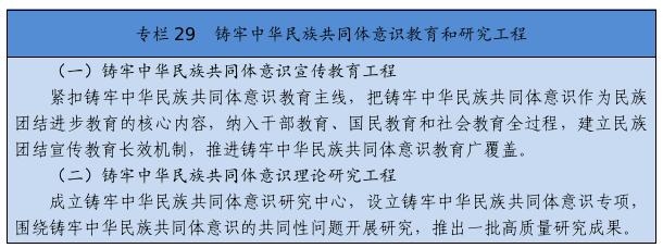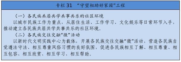 在全社會樹立和突出各民族共享的具有鮮明中華文化特征的文化符號和中華民族視覺形象,打造中國標志。堅定不移推廣普及國家通用語言文字,全面加強國家通用語言文字教育教學(xué),積極穩(wěn)妥推行國家統(tǒng)編教材使用,深化雙語教學(xué)模式改革,確保少數(shù)民族學(xué)生掌握和使用國家通用語言文字。尊重、支持各少數(shù)民族語言文字的學(xué)習(xí)和使用。堅持以社會主義先進文化為引領(lǐng),促進各民族文化交融、創(chuàng)新。提倡文明現(xiàn)代的生活方式,引導(dǎo)和幫助各族群眾追求現(xiàn)代文明生活,推進民族進步。強化全體公民日常行為規(guī)范,完善市民公約、鄉(xiāng)規(guī)民約、學(xué)生守則、行業(yè)規(guī)章、職業(yè)規(guī)則、團體章程,營造自覺遵法守法、尊重少數(shù)民族風(fēng)俗習(xí)慣和宗教信仰、維護民族團結(jié)的社會氛圍。著力開展興邊富民行動,打牢守邊固邊的民族團結(jié)基礎(chǔ)。
