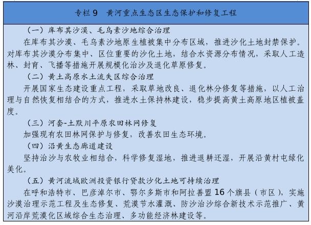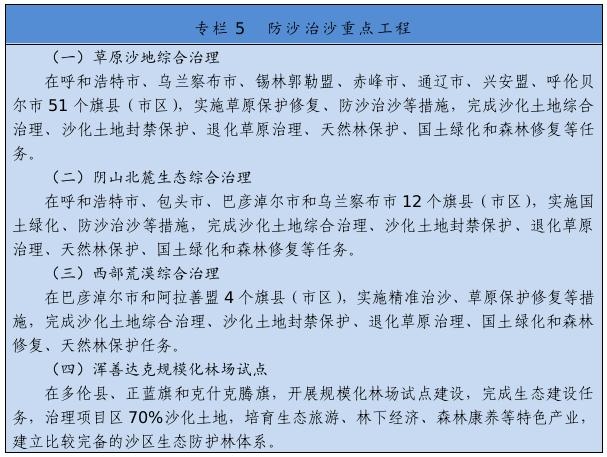 繼續(xù)實施京津風(fēng)沙源治理等重點工程,推廣庫布其沙漠治理方式和沙產(chǎn)業(yè)模式,推動渾善達克、烏珠穆沁、呼倫貝爾沙地治理。推進規(guī)?;謭鼋ㄔO(shè),采取人工造林、封沙育林、飛播造林等方式恢復(fù)植被。建設(shè)荒漠綠洲防護林、防風(fēng)固沙林、沙漠鎖邊林、農(nóng)田草牧場防護林以及水土保持林。以干旱半干旱草原為重點,加強草場改良和人工種草,實行圍封禁牧、劃區(qū)輪牧、季節(jié)性休牧、舍飼圈養(yǎng)等措施,保護和恢復(fù)草原植被。以內(nèi)蒙古高原等為重點,推進防護林體系建設(shè)及退化林修復(fù)、退化草原修復(fù)、京津風(fēng)沙源治理。新增水土流失綜合治理3.33萬平方公里。