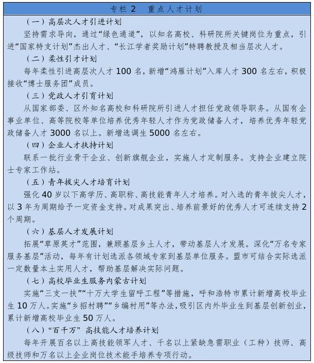 著力抓好高層次創(chuàng)新型領(lǐng)軍人才、青年拔尖人才、高技能人才、各類急需緊缺人才隊伍建設(shè)。實施人才工程計劃,選拔推薦全國杰出專業(yè)技術(shù)人才、政府特殊津貼專家、國家百千萬人才工程人選,組織評選自治區(qū)杰出人才獎、突出貢獻專家、青年創(chuàng)新人才獎,選拔培養(yǎng)自治區(qū)“草原英才”工程、新世紀321人才工程、511人才培養(yǎng)工程人選。實施專業(yè)技術(shù)人才知識更新工程。加強基層專業(yè)技術(shù)人才隊伍建設(shè),引導(dǎo)人才向基層一線和艱苦地區(qū)流動。實施“百千萬”高技能人才培養(yǎng)計劃。