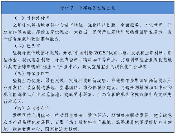 高標準打造稀土新材料、乳業(yè)國家技術(shù)創(chuàng)新中心,在優(yōu)勢特色產(chǎn)業(yè)領(lǐng)域培育一批國家重點實驗室,布局建設(shè)自治區(qū)重點實驗室、工程研究中心、產(chǎn)業(yè)創(chuàng)新中心、技術(shù)創(chuàng)新中心,構(gòu)建形成創(chuàng)新平臺體系。高質(zhì)量建設(shè)呼包鄂國家自主創(chuàng)新示范區(qū)、鄂爾多斯國家可持續(xù)發(fā)展議程創(chuàng)新示范區(qū)和巴彥淖爾國家農(nóng)業(yè)高新技術(shù)產(chǎn)業(yè)示范區(qū)。重點實施國家級高新區(qū)“提質(zhì)進位”行動,爭取包頭稀土、呼和浩特金山、鄂爾多斯三個國家級高新技術(shù)產(chǎn)業(yè)開發(fā)區(qū)在全國高新技術(shù)開發(fā)區(qū)排名晉升5個位次。開展自治區(qū)級高新區(qū)“促優(yōu)培育”行動,推動赤峰、阿拉善、通遼高新區(qū)升級國家級高新區(qū),打造若干創(chuàng)新資源集聚高地。高質(zhì)量推進“科創(chuàng)中國”試點城市建設(shè),大力實施科技創(chuàng)新賦能行動,促進科技經(jīng)濟深度融合。