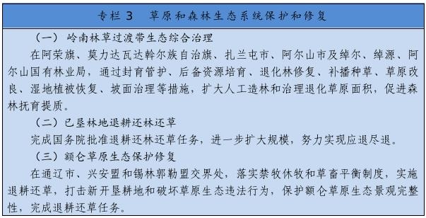 把保護草原、森林作為首要任務(wù),嚴格執(zhí)行基本草原保護制度,落實草原生態(tài)保護補助獎勵政策,完善草畜平衡和草原禁牧休牧制度。嚴禁在草原上亂采濫挖、新上礦產(chǎn)資源開發(fā)等工業(yè)項目,已批準在建運營的礦山、風(fēng)電、光伏等項目到期退出,新建風(fēng)電、光伏電站重點布局在沙漠荒漠、采煤沉陷區(qū)、露天礦排土場,推廣“光伏+生態(tài)治理”基地建設(shè)模式。開展草原生態(tài)承載能力核定和草原生態(tài)系統(tǒng)健康評價,實施草原保護和修復(fù)重大工程??茖W(xué)開展大規(guī)模國土綠化行動,實施三北防護林體系建設(shè)、公益林保護、森林質(zhì)量精準提升等工程,探索大興安嶺一體化保護模式,推進已墾森林草原退耕還林還草,加強森林撫育和退化林修復(fù),提升生態(tài)系統(tǒng)質(zhì)量和穩(wěn)定性。加快構(gòu)建以國家公園為主體的自然保護地體系。