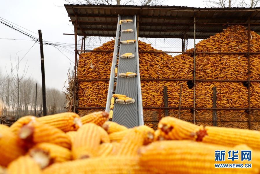 在哈爾濱市巴彥港鎮(zhèn)五星村農(nóng)民程顯義家院內(nèi),玉米通過傳送帶進(jìn)入玉米架子(2020年11月3日攝)。新華社記者 徐凱鑫 攝