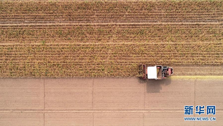 在河北省石家莊市藁城區(qū)梅花鎮(zhèn)朱家莊村的大豆田地里,農(nóng)戶駕駛農(nóng)機(jī)收割大豆(2020年10月10日攝,無人機(jī)照片)。新華社發(fā)(梁子棟 攝)