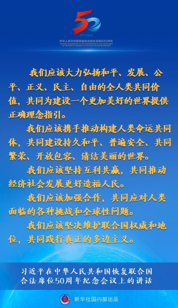 2021年10月25日,國(guó)家主席習(xí)近平在北京出席中華人民共和國(guó)恢復(fù)聯(lián)合國(guó)合法席位50周年紀(jì)念會(huì)議并發(fā)表重要講話。新華社記者李響攝