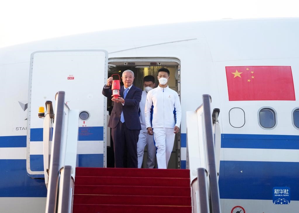 10月20日,在北京首都機(jī)場,北京冬奧組委特別代表、北京冬奧組委副主席于再清(左)手持火種燈走出艙門。隨著北京冬奧組委赴希臘代表團(tuán)抵達(dá)首都機(jī)場,北京冬奧會(huì)火種順利抵達(dá)北京。新華社記者 張晨霖 攝