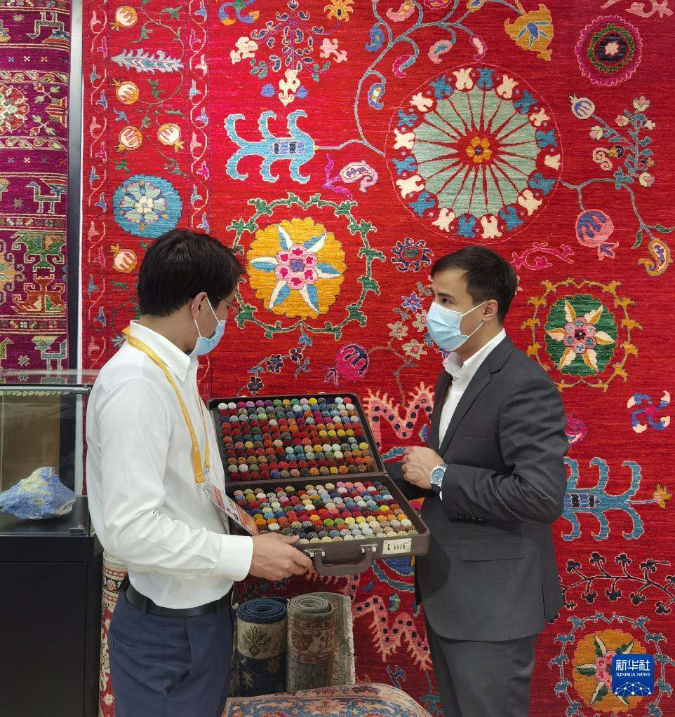 11月5日,阿富汗參展商阿里·法伊茲(右)在第四屆進博會阿富汗手工羊毛地毯展臺忙碌。新華社記者吳宇攝