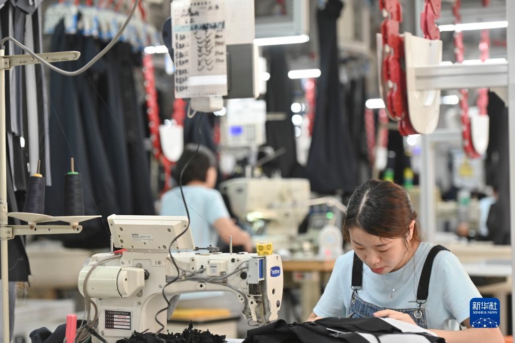 在位于福建省泉州市經(jīng)濟技術開發(fā)區(qū)的九牧王西褲智能化生產(chǎn)車間,工人在自動化西褲吊掛流水線上作業(yè)(7月30日攝)。新華社記者宋為偉攝