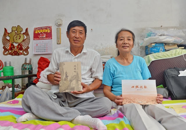 △楊玉芳(左)、高志宏(右)夫婦在家中展示他們所寫的書。