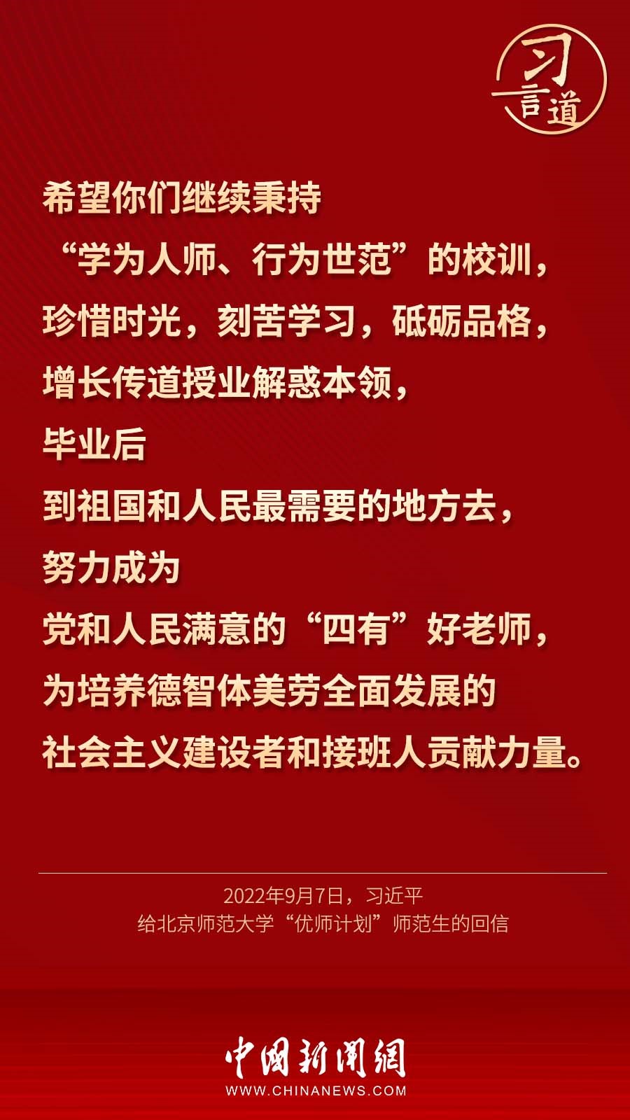 9月7日,習(xí)近平總書記回信勉勵(lì)北京師范大學(xué)“優(yōu)師計(jì)劃”師范生,努力成為黨和人民滿意的“四有”好老師。十八大以來,習(xí)近平多次通過書信的形式,對教師群體寄予殷切期望。