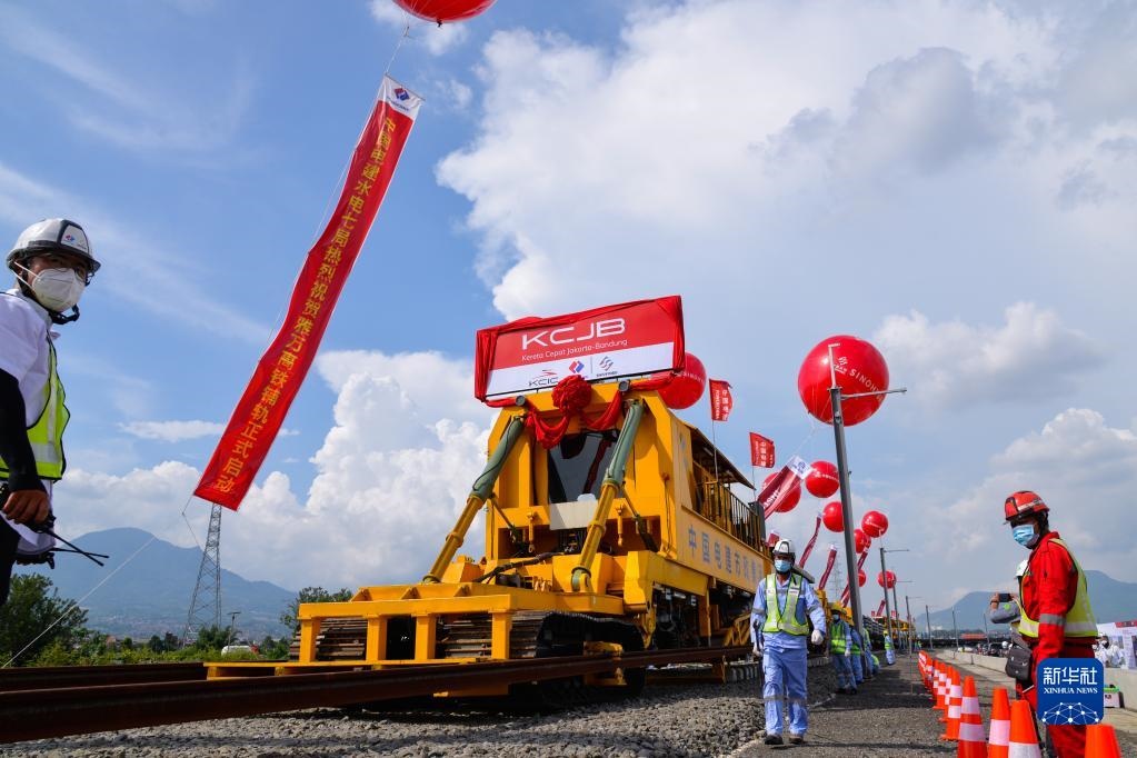 工作人員在印度尼西亞萬隆雅萬高鐵鋪軌施工現(xiàn)場作業(yè)(2022年4月20日攝)。新華社記者徐欽攝