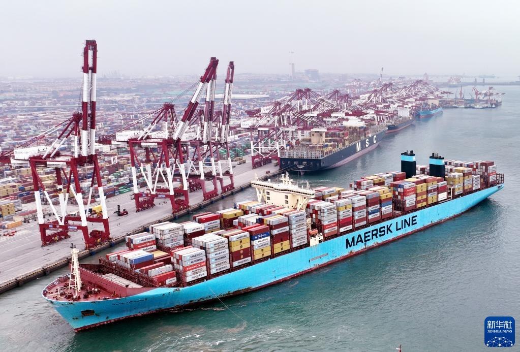 在山東港口青島港前灣碼頭,歐洲貿(mào)易航線的“美途馬士基”集裝箱貨輪解纜起航(2022年7月29日攝,無(wú)人機(jī)照片)。新華社記者李紫恒攝