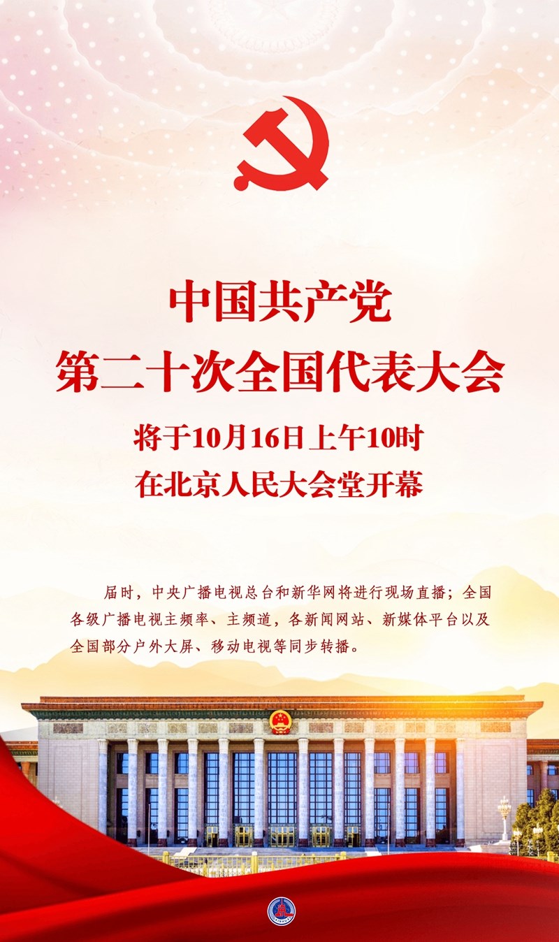 新華社北京10月14日電  中國共產(chǎn)黨第二十次全國代表大會將于16日上午10時在北京人民大會堂開幕。