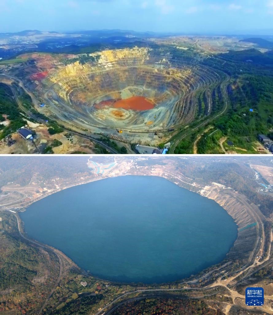 拼版照片:上圖為開采中的安徽省馬鞍山市雨山區(qū)向山鎮(zhèn)凹山采場(資料照片),下圖為生態(tài)修復(fù)后的凹山采場(新華社記者劉軍喜11月8日攝,無人機照片)。新華社發(fā)