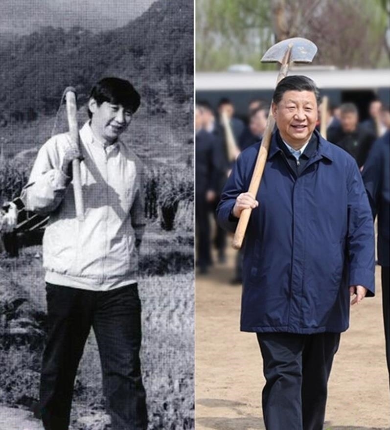 一張是30年后,2019年,總書(shū)記參加首都義務(wù)植樹(shù)。照片中,他扛著鐵鍬,大步走向植樹(shù)地點(diǎn)。