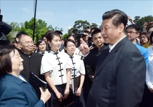 △2014年5月4日,習(xí)近平總書記在北京大學(xué)校園觀看北大師生紀(jì)念五四運(yùn)動95周年青春詩會時同朗誦者親切交談。