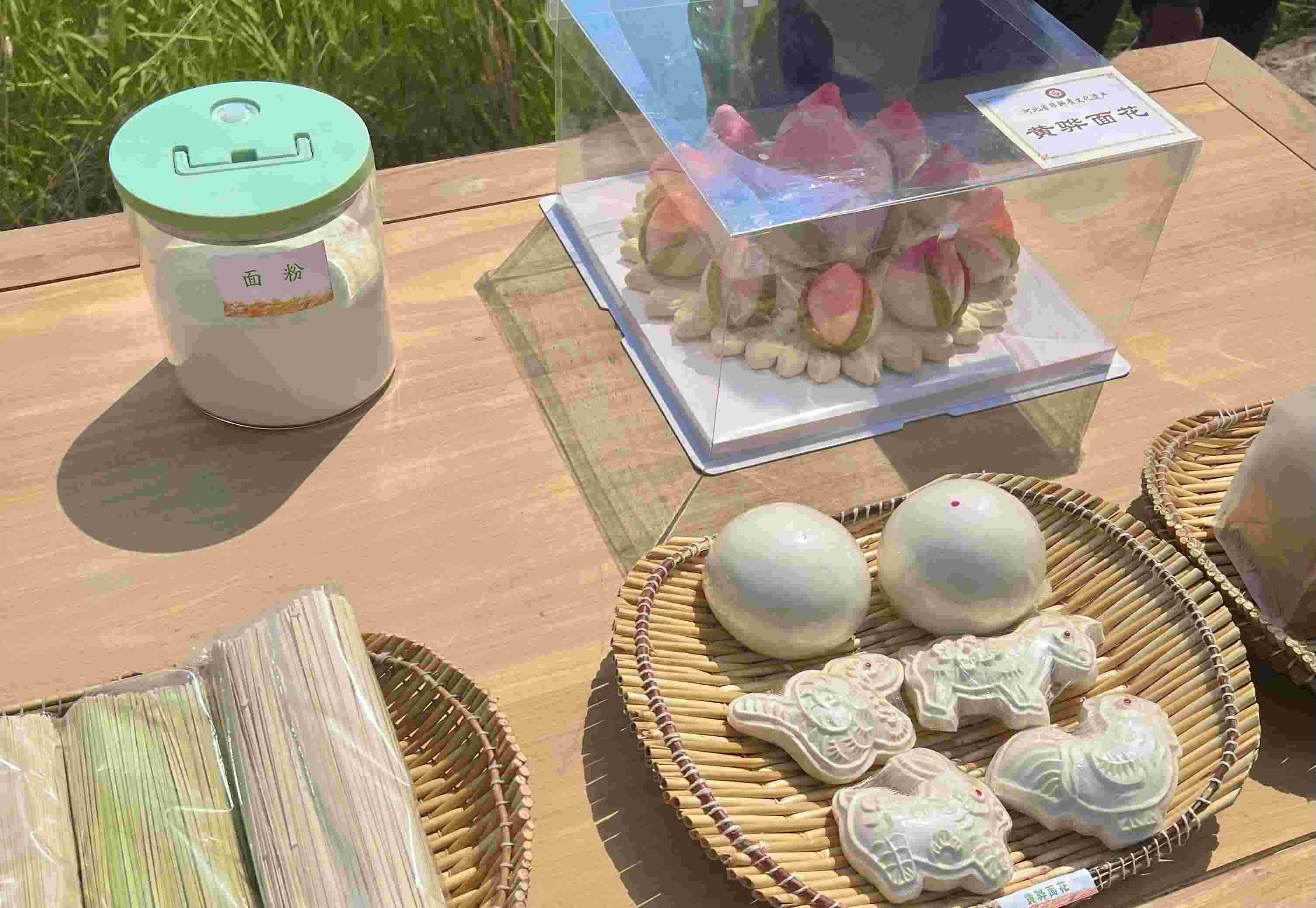 在楊東進(jìn)家麥田的路邊,擺放著一張長方形的木桌。桌上擺放著用于展示的旱堿麥的植株和麥粒樣本,以及由旱堿麥制成的面粉、掛面、饅頭和黃驊面花等產(chǎn)品,總書記在這里駐足觀看。印刻著寓意吉祥圖案的黃驊面花,被列為省級(jí)非物質(zhì)文化遺產(chǎn)。