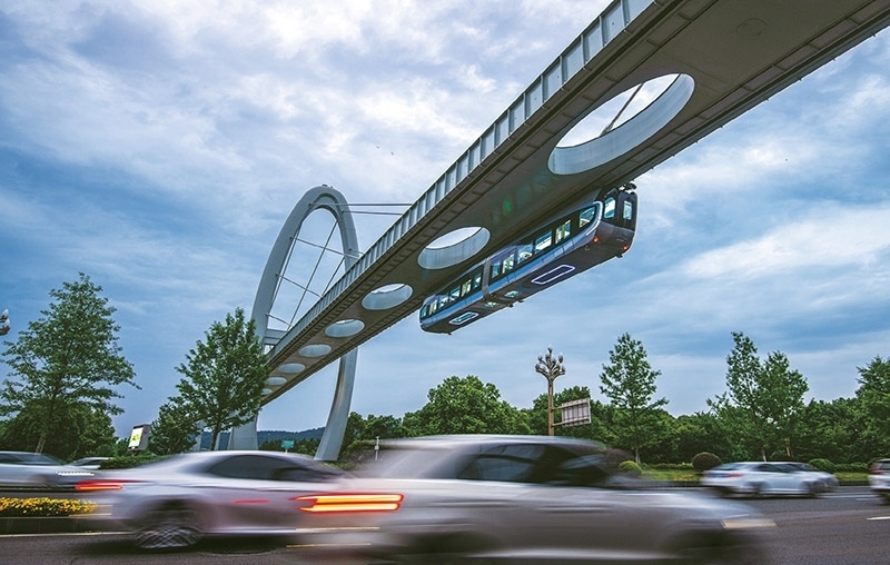 列車(chē)懸掛在軌道下方,從人們頭頂飛馳而過(guò),這樣的科幻場(chǎng)景,最近在武漢東湖新技術(shù)開(kāi)發(fā)區(qū)成了現(xiàn)實(shí)。圖為2023年5月9日,武漢“光谷光子號(hào)”空軌列車(chē)在綜合聯(lián)調(diào)和試運(yùn)行中。 新華社記者 肖藝九/攝