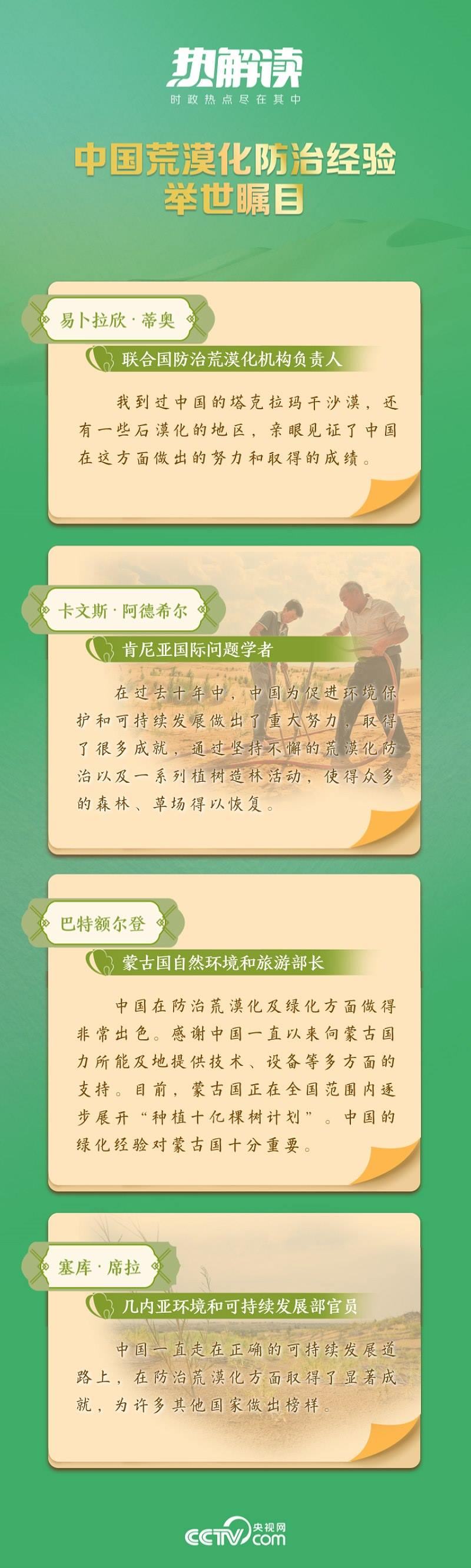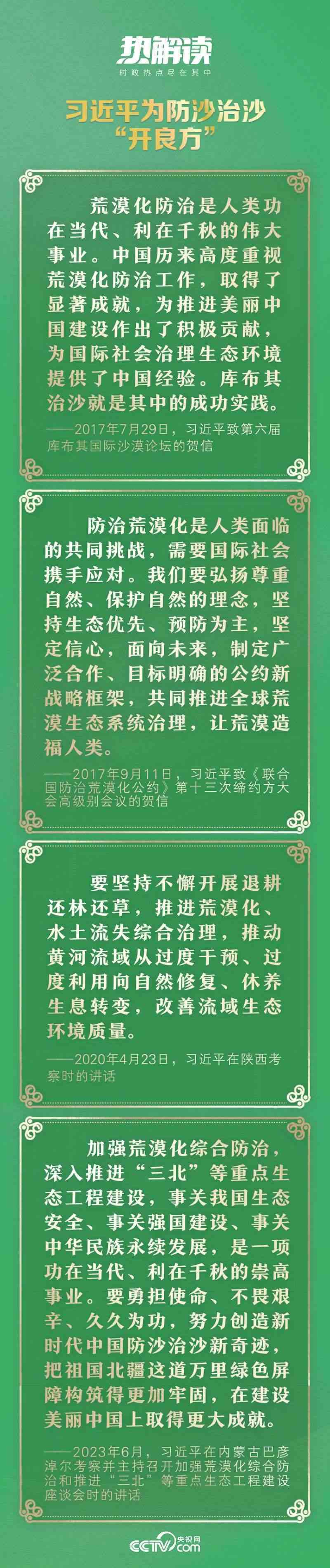 在6月6日召開的座談會上,總書記講到從“沙進人退”到“綠進沙退”的歷史性轉變,講到荒漠化區(qū)域經濟社會發(fā)展和生態(tài)面貌發(fā)生了翻天覆地的變化,講到荒漠化和土地沙化實現(xiàn)“雙縮減”,講到防沙治沙法律法規(guī)體系日益健全……這些成績,讓14億多中國人民都倍感榮光。