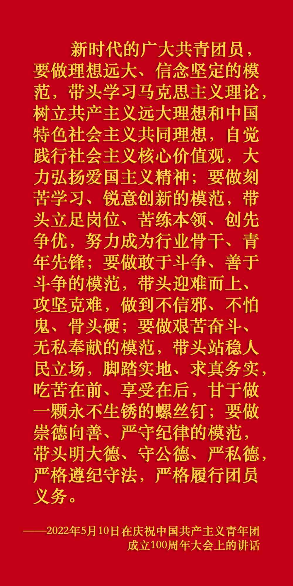 在慶祝中國(guó)共產(chǎn)主義青年團(tuán)成立100周年大會(huì)上,習(xí)近平總書(shū)記從黨和國(guó)家事業(yè)發(fā)展全局出發(fā),給共青團(tuán)明確提出了4點(diǎn)希望,飽含深情、催人奮進(jìn)。