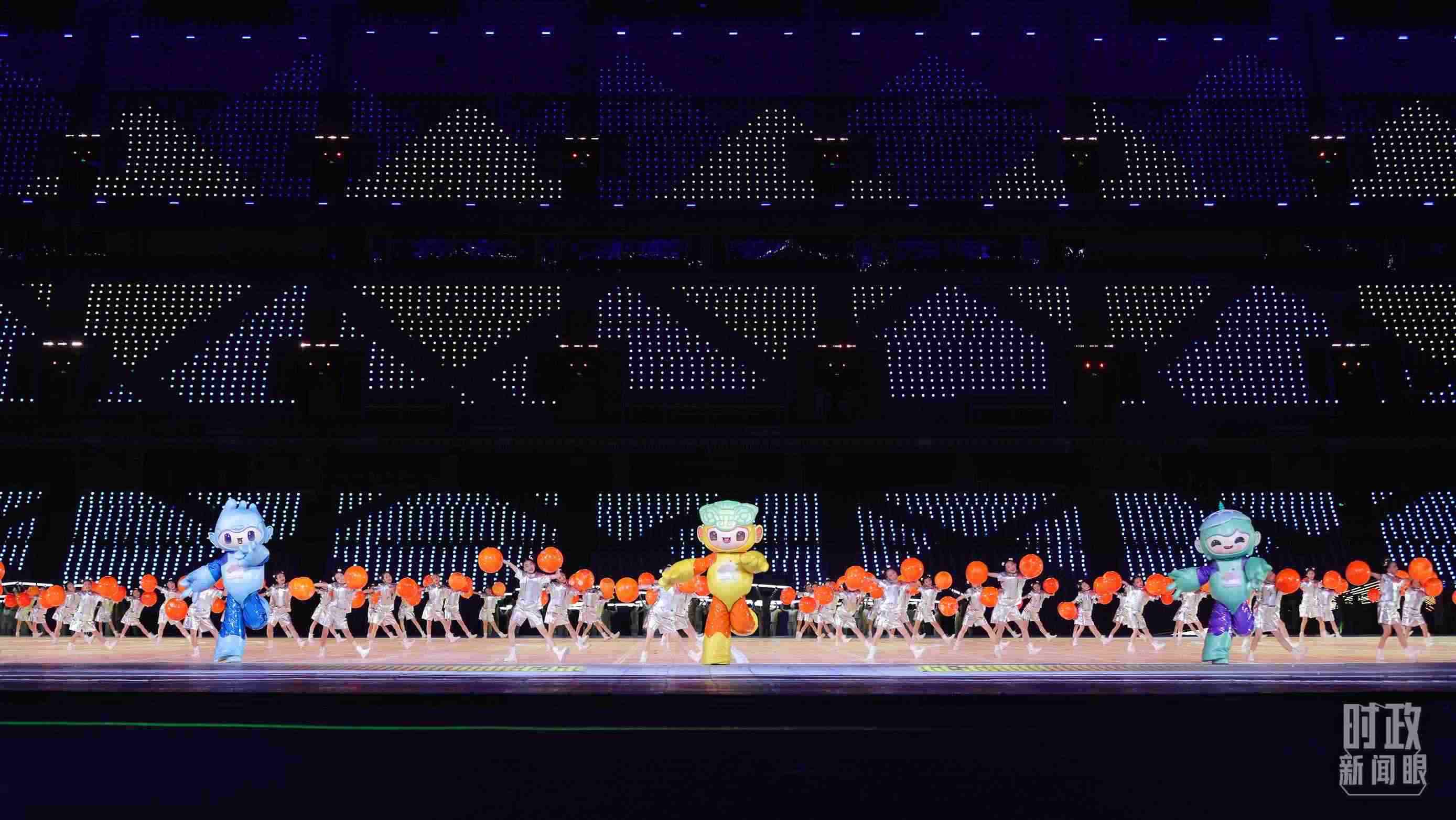 △開幕式文藝表演中的亞運(yùn)會吉祥物。(總臺央視記者魏幫軍拍攝)