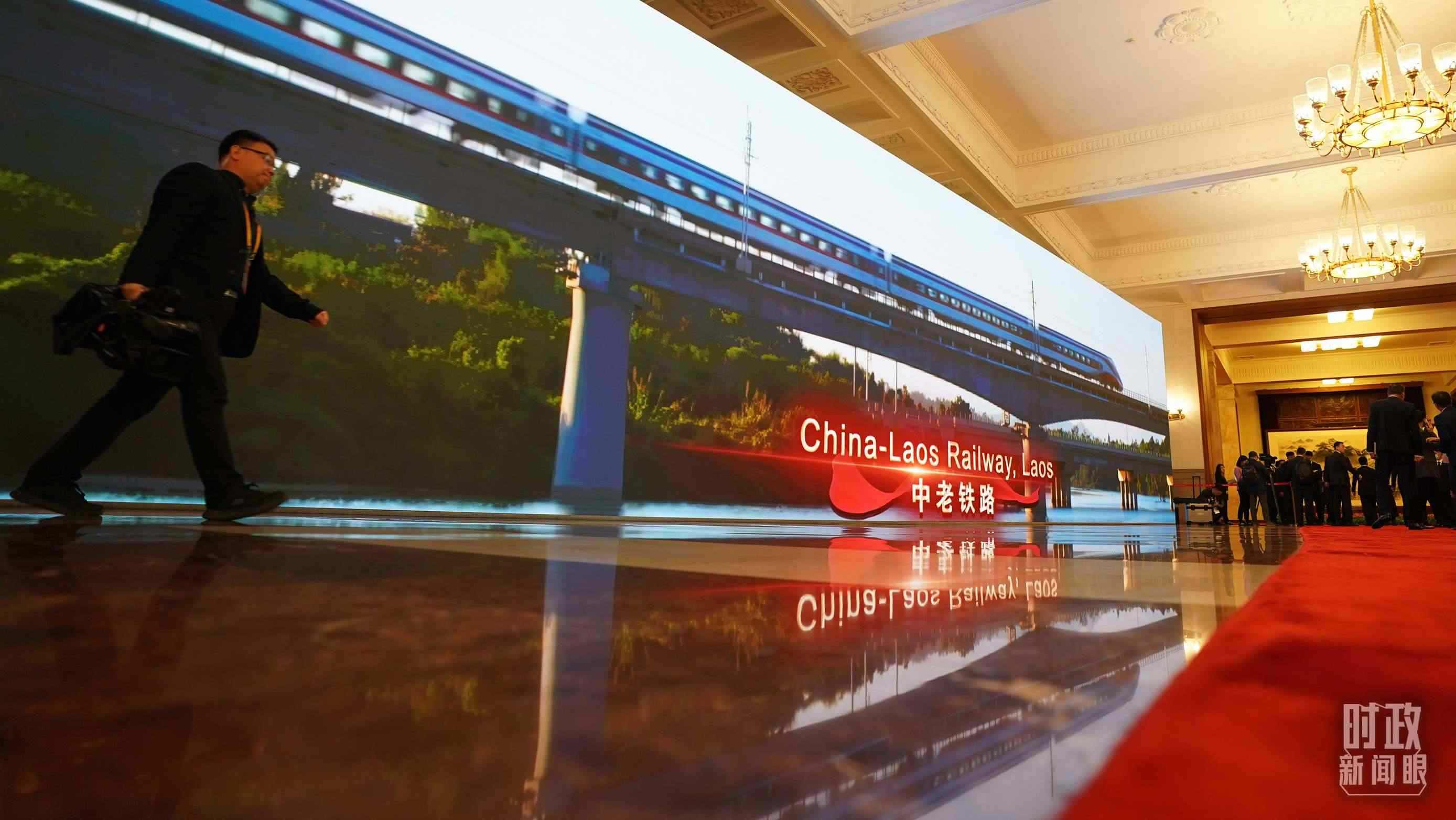 △人民大會堂內(nèi)大屏幕展示共建“一帶一路”合作項(xiàng)目。(總臺國廣記者李晉拍攝)