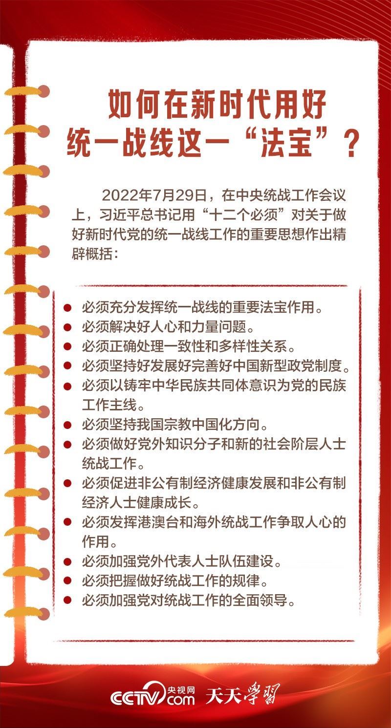 在百余年的奮斗歷程中,我們黨始終把統(tǒng)一戰(zhàn)線擺在重要位置,讓團(tuán)結(jié)的旋律始終高昂,共同奮斗的力量始終激蕩。從“重要法寶”到“強(qiáng)大法寶”,體現(xiàn)出總書記對(duì)黨的統(tǒng)戰(zhàn)工作一以貫之的高度重視。