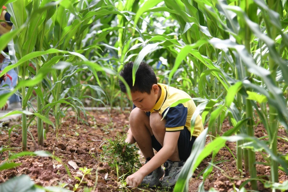 5月31日,學生在之江小學勞動實踐基地除草。