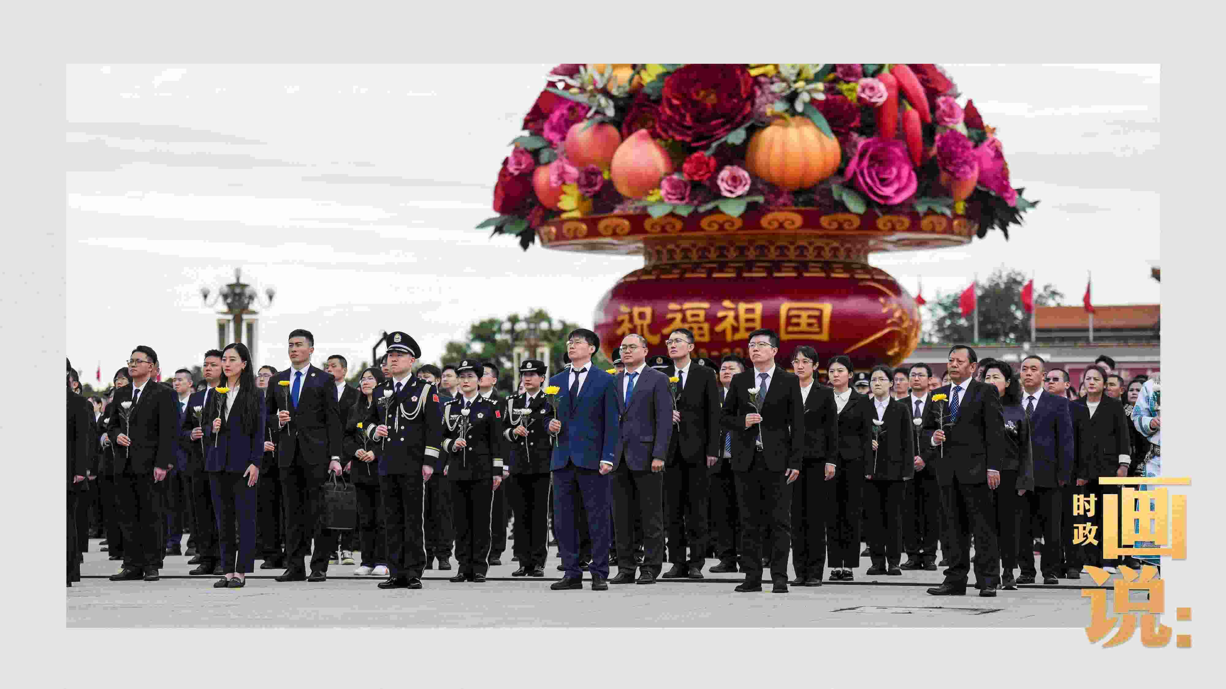 △天安門廣場中央,“祝福祖國”巨型花籃表達(dá)著對國家繁榮富強(qiáng)的美好祝福。