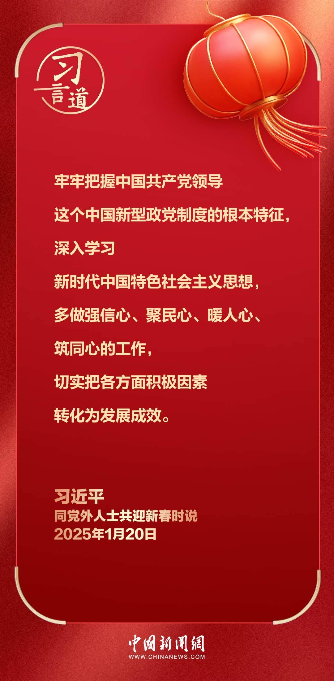 在中華民族傳統(tǒng)節(jié)日乙巳蛇年春節(jié)即將到來(lái)之際,中共中央總書(shū)記、國(guó)家主席、中央軍委主席習(xí)近平20日在人民大會(huì)堂同各民主黨派中央、全國(guó)工商聯(lián)負(fù)責(zé)人和無(wú)黨派人士代表歡聚一堂,共迎佳節(jié)。習(xí)近平代表中共中央,向各民主黨派、工商聯(lián)和無(wú)黨派人士,向統(tǒng)一戰(zhàn)線(xiàn)廣大成員,致以誠(chéng)摯問(wèn)候和新春祝福。
