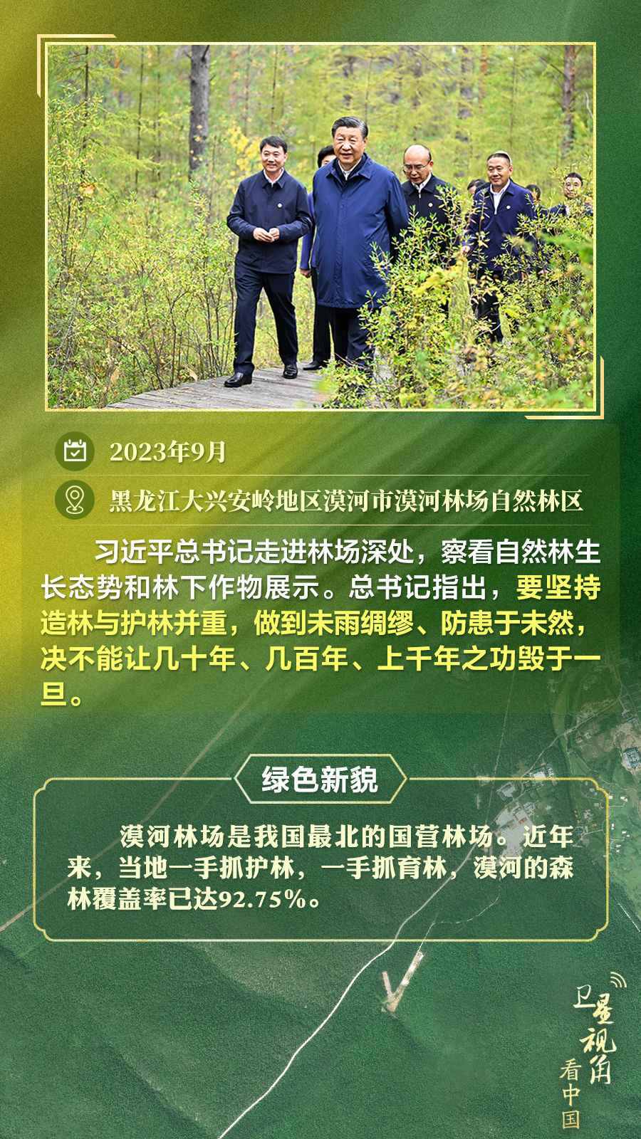 通過衛(wèi)星視角,一起俯瞰總書記去過的這些林區(qū),重溫總書記對(duì)造林護(hù)林的殷殷囑托,感受綠色新貌。