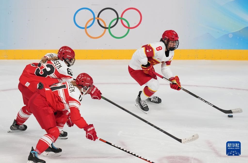 2月4日,中國隊球員林綺琪(中)在比賽中進攻。當日,在五棵松體育中心舉行的北京冬奧會女子冰球小組賽中,中國隊以3比1戰(zhàn)勝丹麥隊。新華社記者 薛宇舸 攝