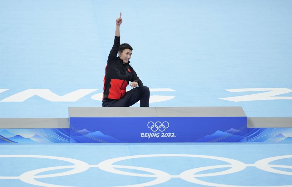 2月12日,冠軍中國(guó)選手高亭宇在獎(jiǎng)牌頒發(fā)儀式上一躍而上頒獎(jiǎng)臺(tái)。新華社記者程婷婷攝
