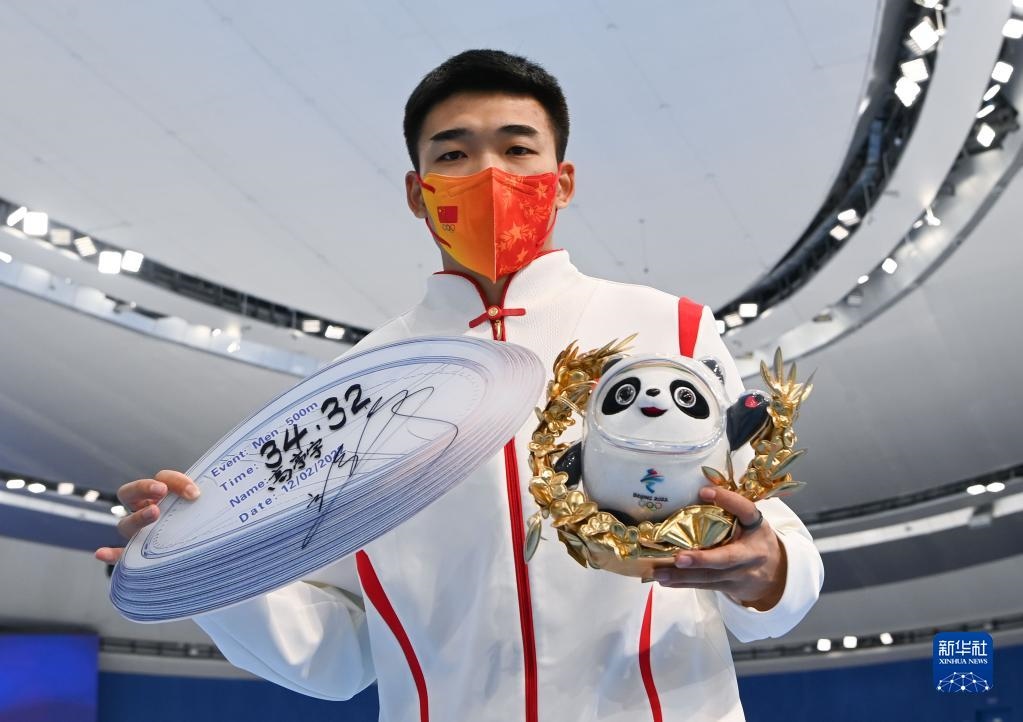 2月12日,冠軍中國隊選手高亭宇展示自己在速度滑冰男子500米決賽中的成績。新華社記者武巍攝