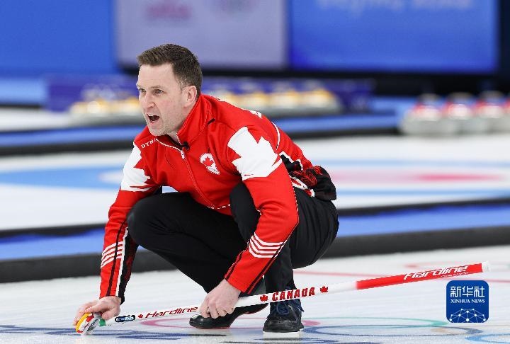 2月18日,加拿大隊選手布拉德·古休在冰壺男子銅牌賽比賽中。新華社記者王婧嬙攝