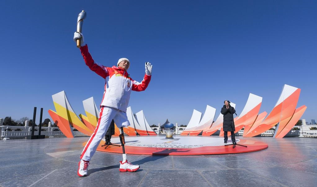 3月2日,火炬手侯斌在天壇圜丘傳遞城市火種火炬。新華社記者 夏一方 攝