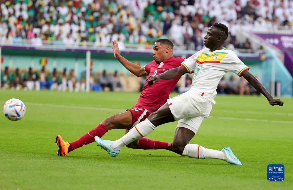 11月25日,塞內(nèi)加爾隊球員迪亞塔與卡塔爾隊球員佩德羅·米格爾拼搶。新華社記者 王東震 攝
