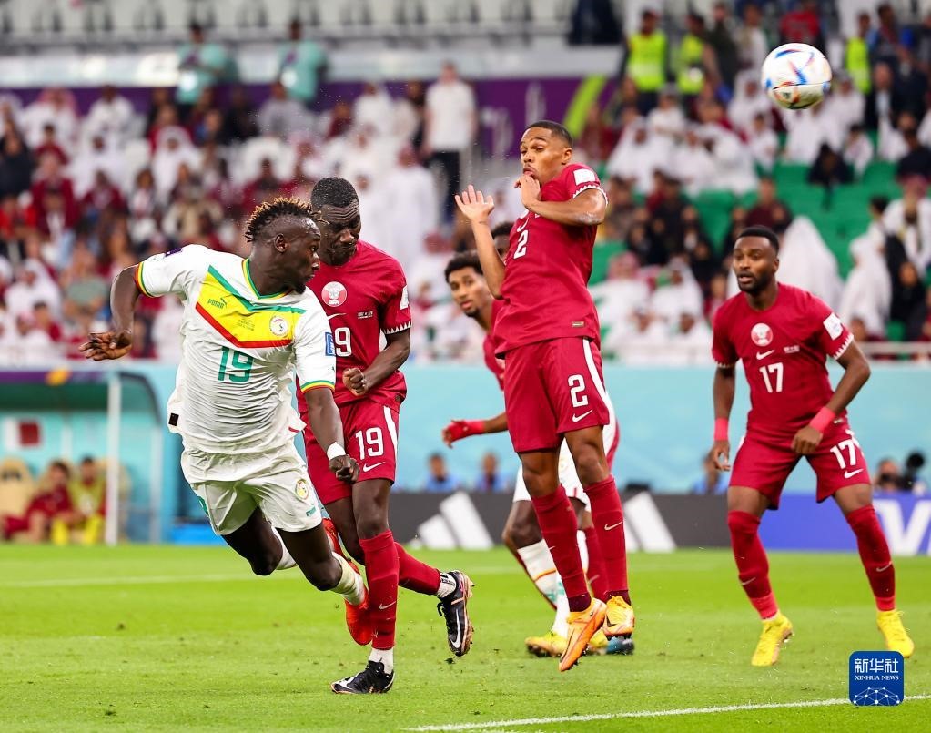 11月25日,塞內(nèi)加爾隊球員迪德希歐(左一)頭球破門,取得球隊第二粒進球。新華社記者 丁旭 攝