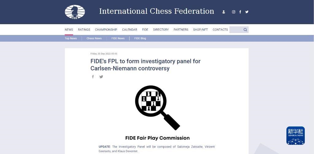 這是國際棋聯(lián)2022年9月30日在官網(wǎng)公布的關于作弊風波,決定成立調(diào)查小組的新聞頁面。新華社發(fā)