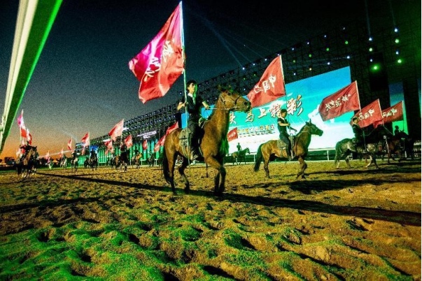 開幕式文體表演由《馬術(shù)方陣一馬當先》、歌伴舞《我的城我的馬》、《名馬展示策馬揚鞭》、《單馬技巧雙翼神馬》、《馬障礙秀躍馬揚鞭》、《馬術(shù)秀人馬合一》、歌伴舞《騎跡包頭》、《無人機秀馬上精彩》八塊內(nèi)容組成。當晚的賽汗塔拉馬術(shù)賽場流光溢彩、氣氛熱烈,場內(nèi)座無虛席、歡聲雷動。20時30分許,主騎手手持國旗,副騎手手持馬城旗幟,運動員方陣、民族方陣、女騎方陣、馬主方陣入場,騎手們精神飽滿、英姿颯爽,不時揮手致意,現(xiàn)場觀眾用熱烈的掌聲和歡呼聲,歡迎他們的到來。達茂旗9歲賽馬冠軍阿茹樂手持彩旗引出世界名馬亮相,40對人馬合一的“千古馬頌”表演震撼全場,1000架無人機躍然天空,點亮“騎跡包頭 馬上精彩”的字樣……藍天、碧水、凈土的包頭在策馬奔騰的馬術(shù)競技中拉開了“中國馬城”的壯麗畫卷。