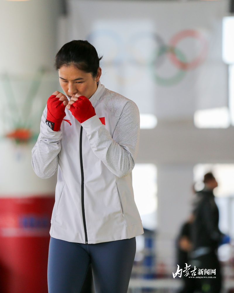 當(dāng)日,記者在拳擊館內(nèi)看到,在訓(xùn)練中李倩腳步輕盈,汗珠在額頭滑落。她戴上拳套,走向沙袋,一記記重拳砸出,發(fā)出沉悶的“砰”聲。內(nèi)蒙古女子拳擊隊的數(shù)十名拳手正在同時訓(xùn)練,沙袋晃動,呼吸急促,空氣中彌漫著汗水與堅持的味道?!胺朗兀_下要穩(wěn)!”內(nèi)蒙古拳擊隊總教練哈達(dá)巴特爾的聲音在空間回蕩。李倩的訓(xùn)練格外嚴(yán)格。除了常規(guī)力量訓(xùn)練、反應(yīng)訓(xùn)練和體能循環(huán),她還要進行一對一的與男拳手的實戰(zhàn)模擬,幾次交鋒下來,氣息都愈發(fā)急促。但李倩沒有退縮,反而越打越穩(wěn),腳步靈活,出拳干凈利落。
