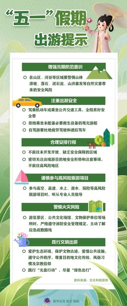 文化和旅游部近日發(fā)布“五一”假期出游提示,提醒廣大游客增強汛期防范意識、注重出游安全、合理安排行程、謹(jǐn)慎參與高風(fēng)險旅游項目、警惕火災(zāi)風(fēng)險、踐行文明出游。