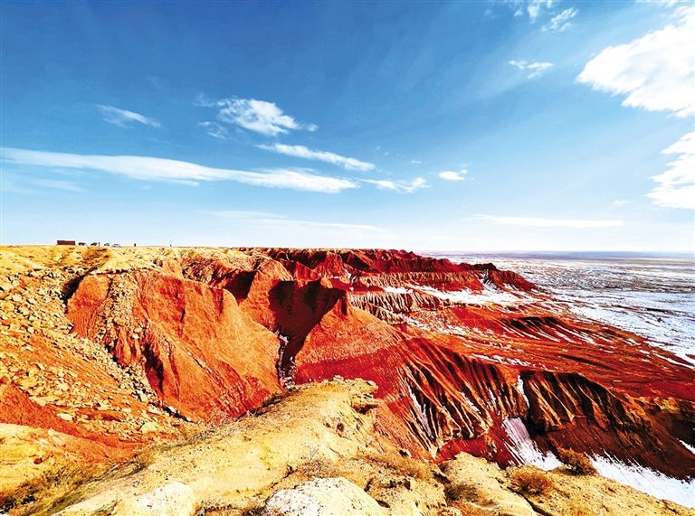 四子王旗大紅山,赤色丹霞地貌與雪原戈壁相映,繪就塞北獨(dú)有的蒼茫壯闊。王錦業(yè) 攝