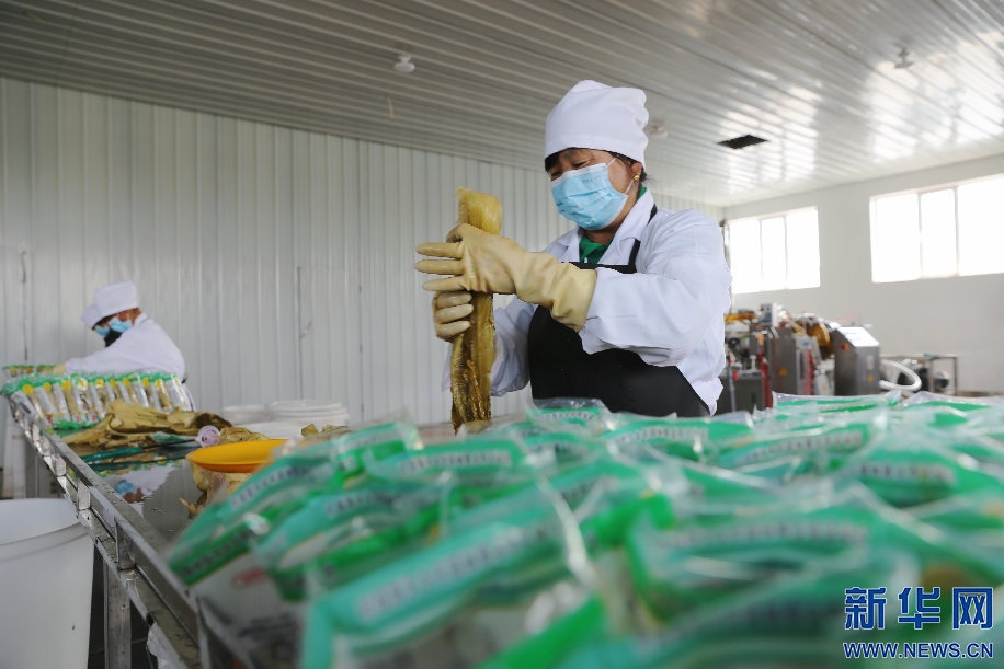 6月11日,內(nèi)蒙古自治區(qū)杭錦旗中圖村農(nóng)民米蘭在當(dāng)?shù)胤N植合作社醬腌菜生產(chǎn)加工廠工作。新華網(wǎng)曹楨攝