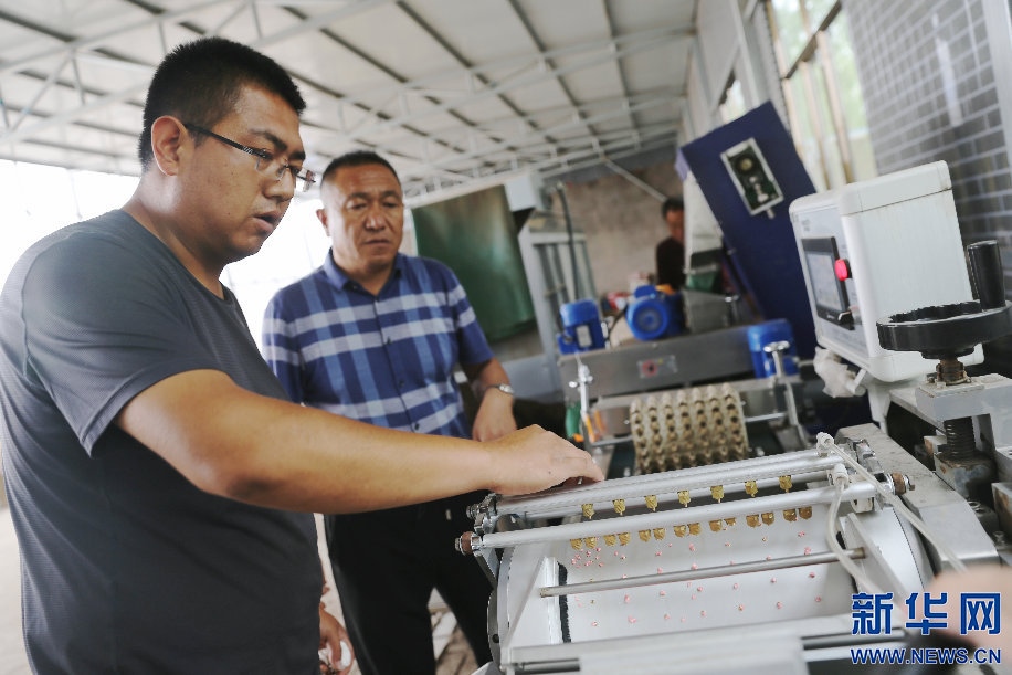 6月9日,李宏和李鵬博在廠房里操作自動播種機(jī)播種辣椒苗。新華網(wǎng)曹楨攝