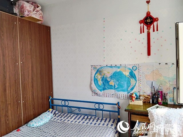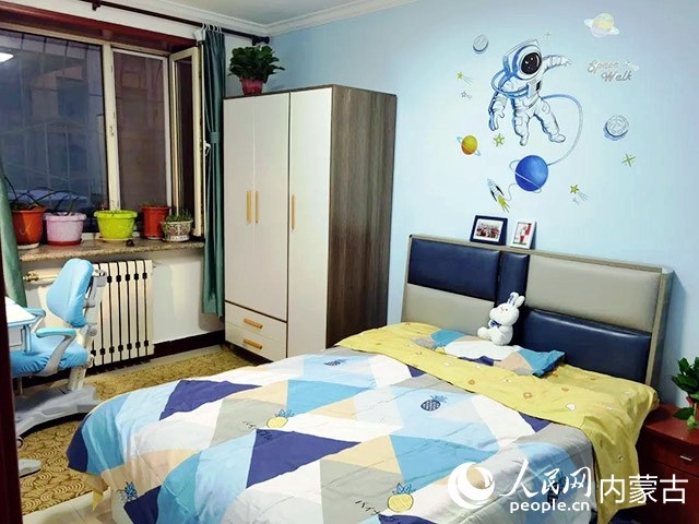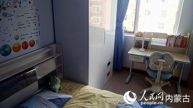 在對(duì)原有住房進(jìn)行規(guī)劃、設(shè)計(jì)后,施工隊(duì)開始裝修,并配備必要的家具、臥具和學(xué)習(xí)生活用品。歷時(shí)半個(gè)多月,一間以藍(lán)色為主色調(diào)的小屋建成了?,F(xiàn)在,屬于浩博的那一半臥室,泛黃的臥室墻壁被粉刷成淡藍(lán)色,換了新的小床和衣柜,新添置的書桌上擺滿了課外書,看起來整潔又溫馨。