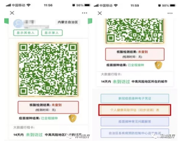 市民7天內所做的核酸檢測結果會在健康碼綠碼下方顯示,7天之后信息會轉到綠碼下方的“個人健康風險評估(初步流調)表”中,點擊后可查看最近3次的核酸檢測結果。核酸檢測結果具體到日期和具體時點。