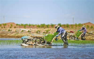 沙漠水稻插秧。本報(bào)記者孟和朝魯攝