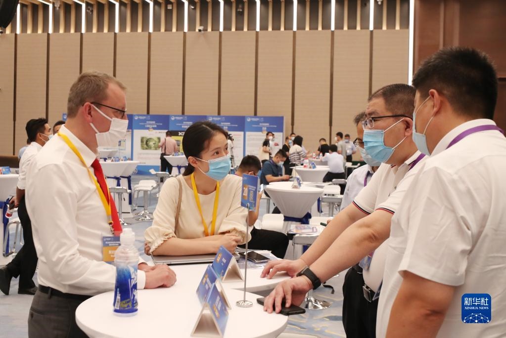 第五屆進博會技術(shù)裝備展區(qū)展前供需對接會在上海舉行。這是參展商代表(前左二)在對接會上向采購商介紹企業(yè)產(chǎn)品情況(2022年8月8日攝)。新華社記者 方喆 攝